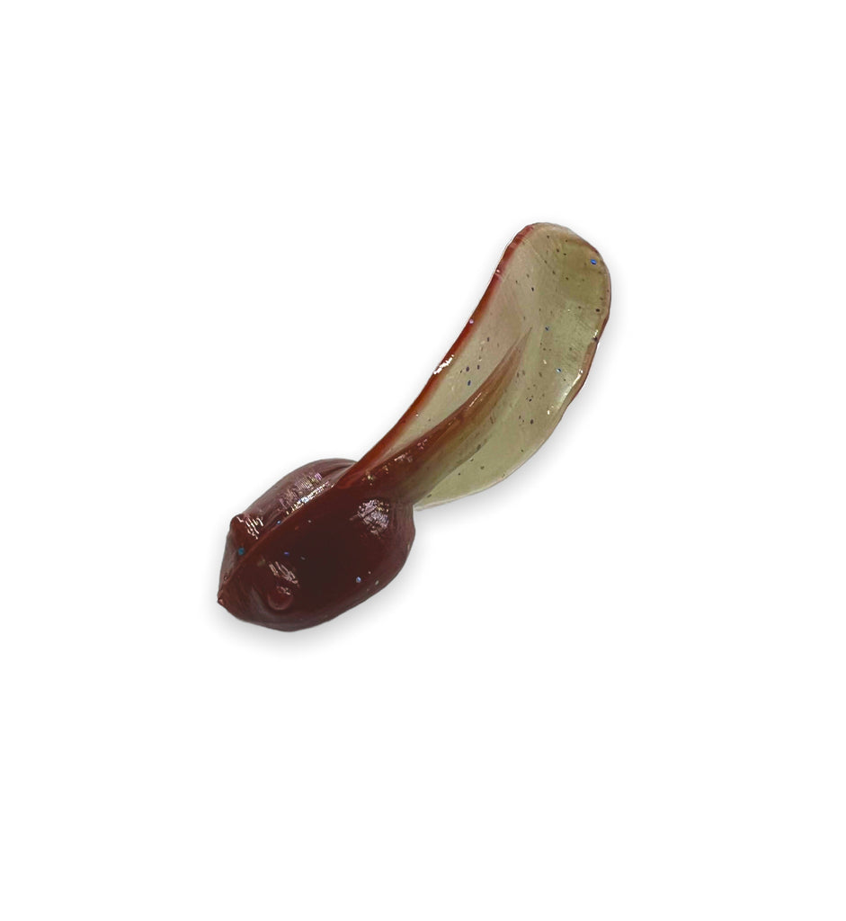 Rig a tadpole on a light jig head and swim it slowly along weed edges — its gentle tail kick will draw bites from both bass and panfish.